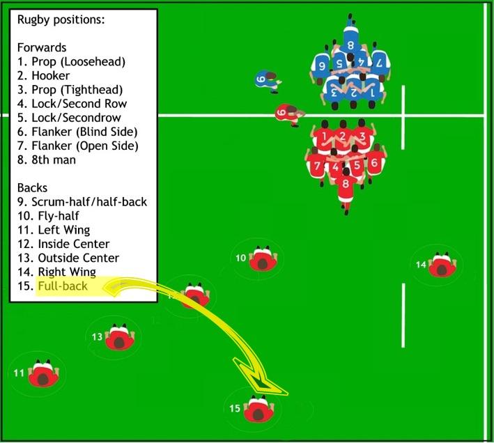 • ฟูลแบ็ก (Fullback – เบอร์ 15): ปราการหลังด่านสุดท้าย หน้าที่คือรับลูกเตะของคู่แข่งและคุมพื้นที่ว่างด้านหลังทั้งหมด ต้องมีทักษะการรับลูกโด่งและการเตะแก้สถานการณ์ที่ยอดเยี่ยม